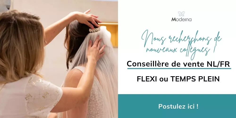 Forte de plus de 65 ans d’expérience, faites confiance à Moderna à Schepdaal pour vivre un essayage unique. Nos conseillères passionnées vous accompagneront avec des conseils personnalisés, depuis le choix de votre robe jusqu’à son ajustement sur-mesure, grâce à notre atelier de couture sur place.